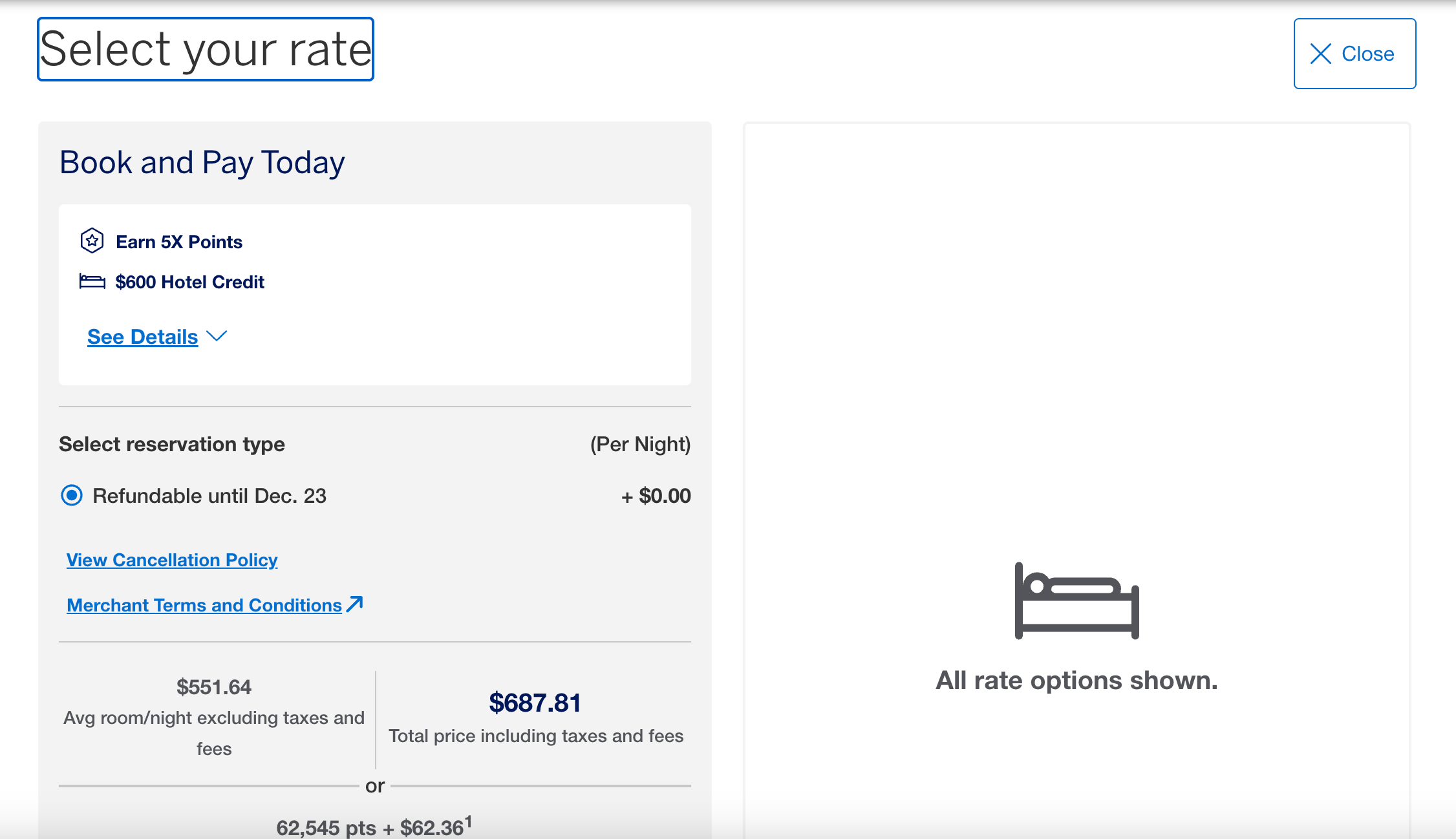 That’s what I personally am used to seeing when booking hotels. And, because stays are eligible for the Amex hotel credit if they’re prepaid, I assumed that meant they’d be non-refundable. So when I went to use my credit and saw a refundable option as the only one available, it threw me for a loop.